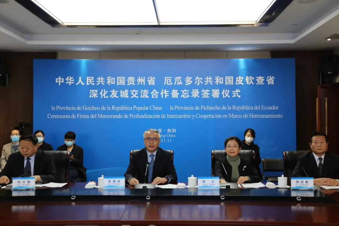 11月10日上午,贵州省与厄瓜多尔皮钦查省签署深化友城交流合作备忘录视频会议在贵阳举行。副省长蔡朝林、皮钦查省省长帕冯、中国驻厄瓜多尔大使陈国友,我校党委副书记、校长刘兴德,省对外友好协会专职副会长蒋红等有关领导出席活动。
