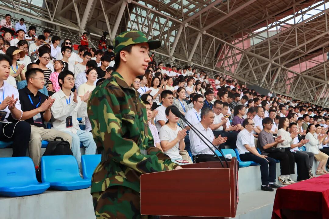 魏俊源同学代表全体参训新生发言,承诺在军训中磨砺出坚定执着的精神品质,养成良好的学习和生活作息习惯,增强集体意识,以崭新的精神面貌开启大学生活。
