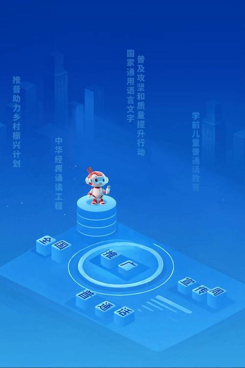海报二:以蓝色为基调,首次设计上线“推普数字人”形象,并融合键盘、屏幕等数字化元素,体现语言文字服务促进数字化智能化发展,以及数智赋能激发语言文字高质量发展的创新动力。动态海报中,推普数字人跳跃并点击象征键盘和屏幕的数字化元素上的文字,突出语言文字智能化发展融入大众生活、服务国家科技创新等的重要作用。