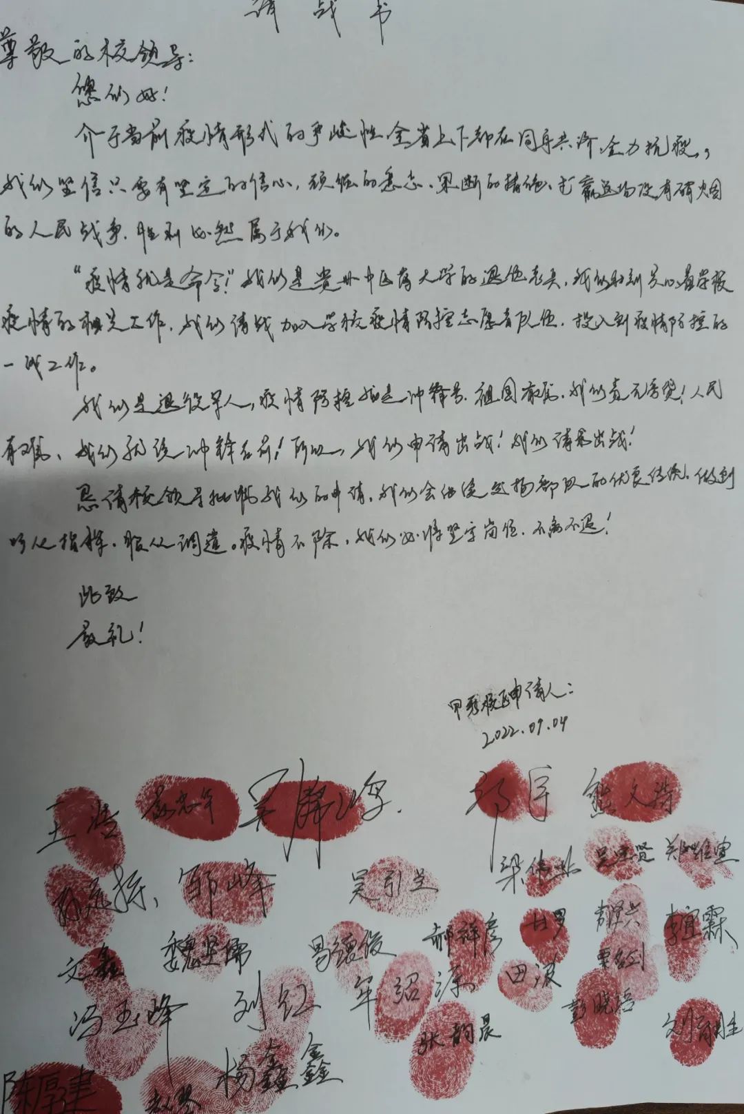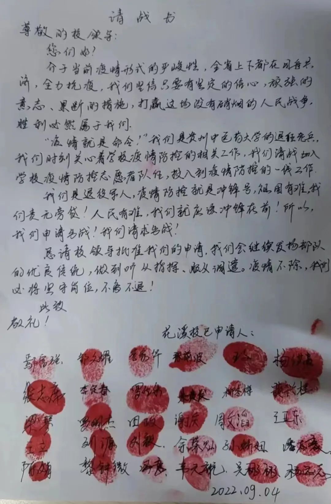 贵阳市本轮疫情爆发以后,学校迅速实行封控管理。 “疫情就是命令,防控就是责任。”两个校区的57名退伍士兵不约而同地向学校递交“请战书”,主动请战,表达“疫情不除,必将坚守岗位,不离不退”的决心。