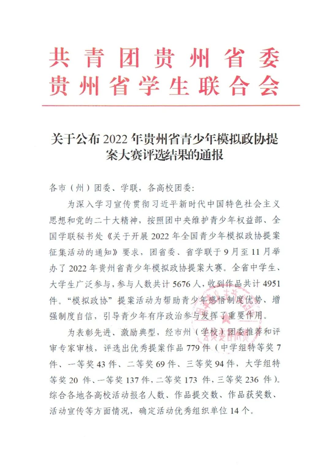 为深入学习宣传贯彻习近平新时代中国特色社会主义思想和党的二十大精神,按照团中央维护青少年权益部、全国学联秘书处《关于开展2022年全国青少年模拟政协提案征集活动的通知》要求,共青团贵州省委、贵州省学生联合会于2022年9月至11月联合举办了2022年贵州省青少年模拟政协提案大赛。