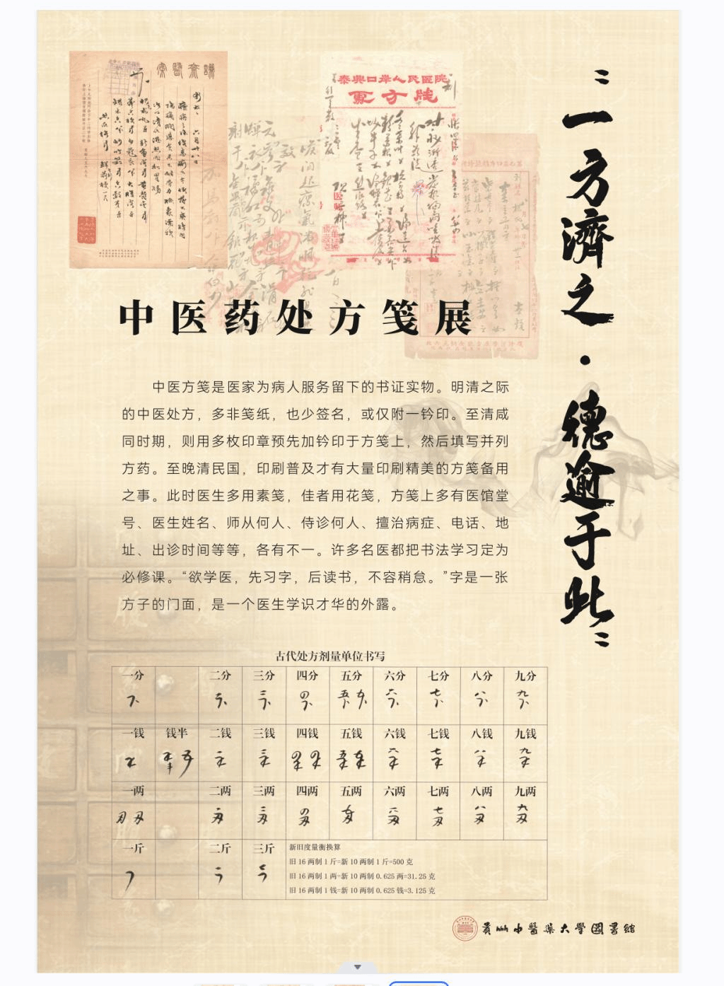 作为此次阅读推广系列活动的重要组成部分,“一方济之·德逾于此”中医药处方笺展于当天开展。活动展出了我校教师杜文章博士收藏的晚清以来处方笺50余幅,杜文章以一首读书歌与大家共勉:“春读书,兴味长,磨其砚,笔花香。读书求学不宜懒,天地日月比人忙。燕语莺歌希领悟,桃红李白写文章。”