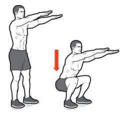 2.屈髋屈膝向下蹲,直至大腿前侧与地面平行。