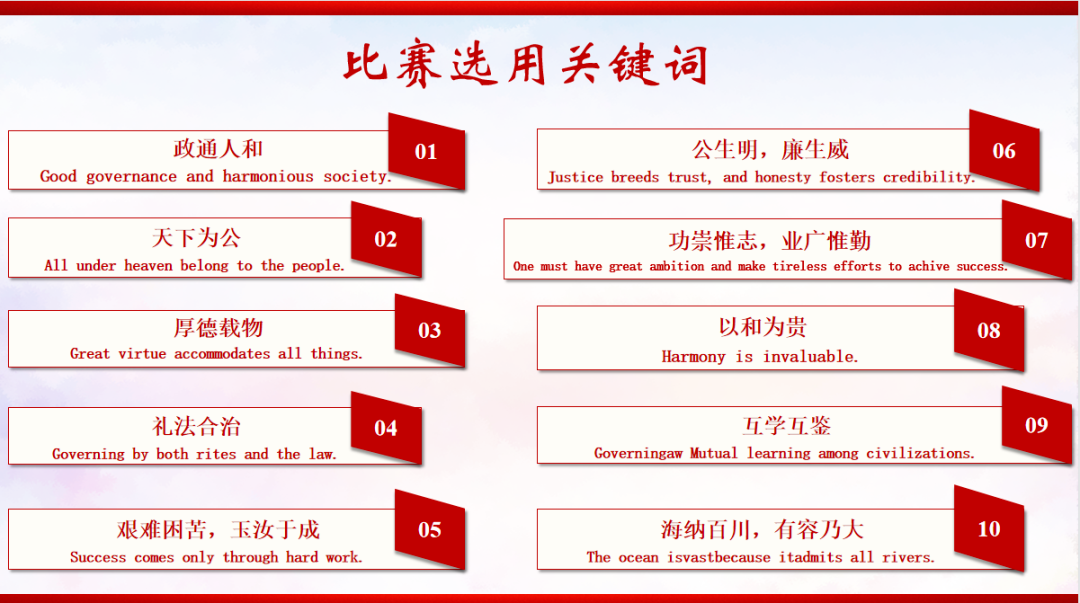 比赛分为初赛、复赛、决赛三个阶段,来自各学院的330余名选手参赛,附院教师首次参赛。参赛选手根据《中国关键词:文明理念篇》一书选取文章诵读并提交音频进行参赛,围绕政通人和、天下为公等十个关键词撰写英语诵读文章并提交诵读视频。