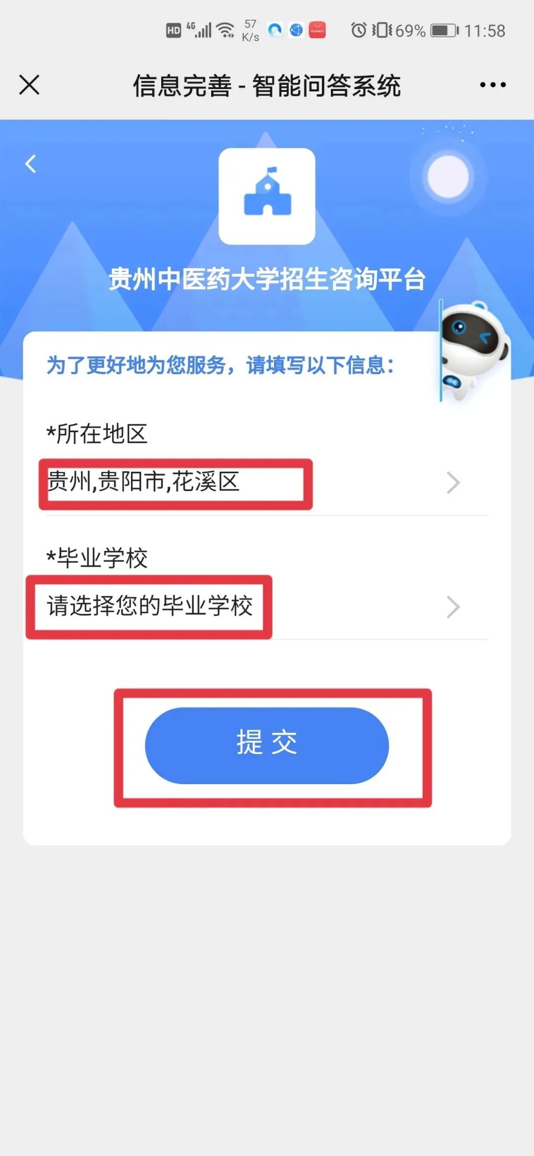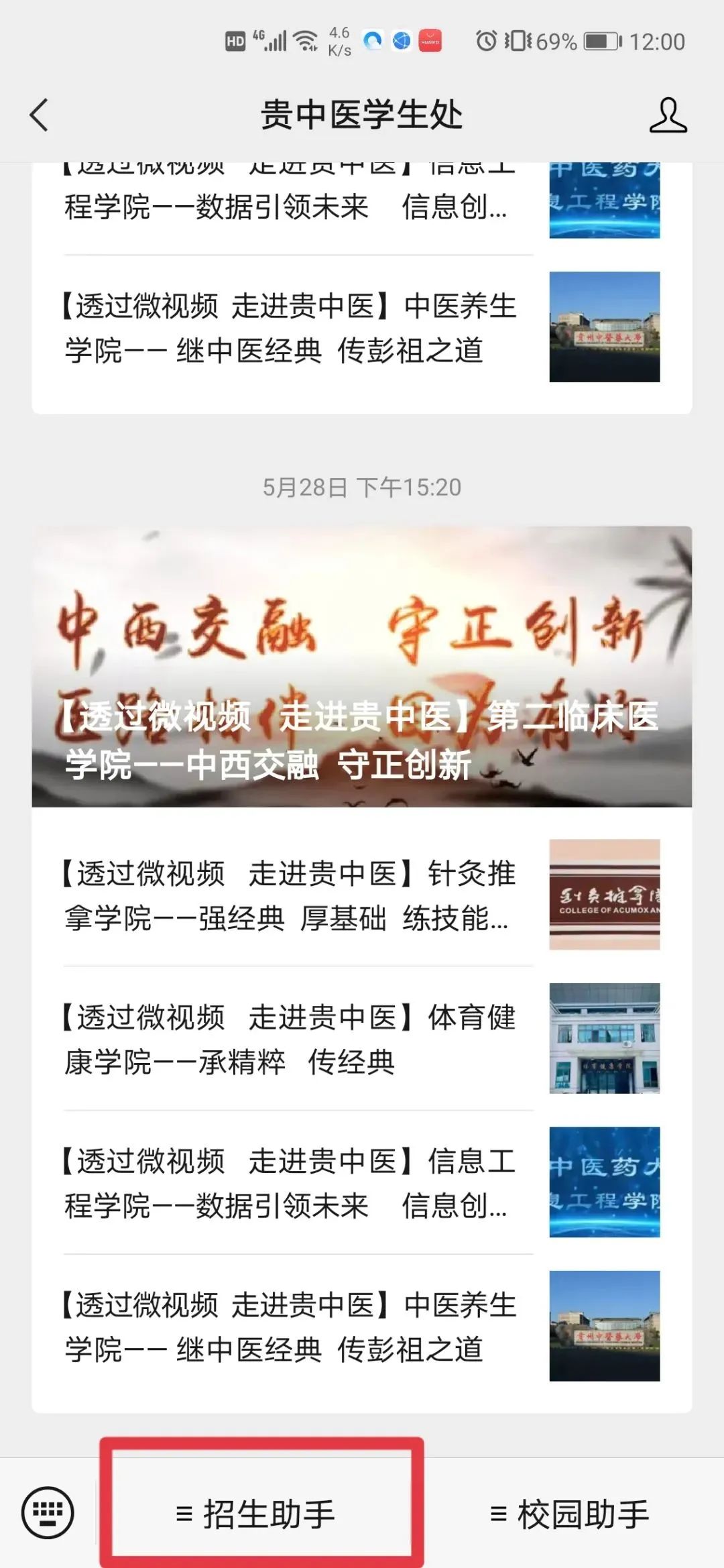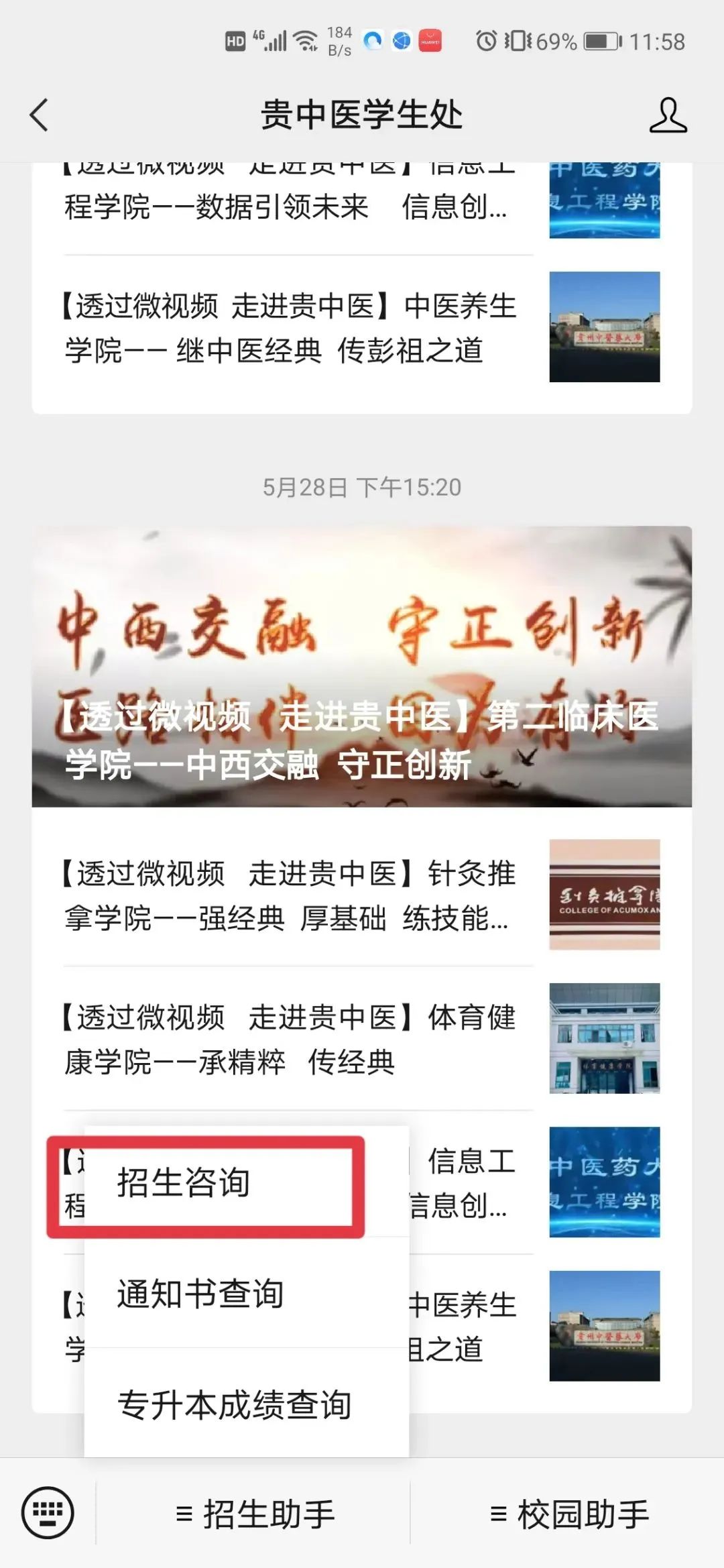 关注“贵中医学生处”官方微信号,点击“招生助手”选择“招生咨询”,完善相关信息点击“提交”,就可以在线咨询您想知道问题的答案啦!我们会尽快给您回复!