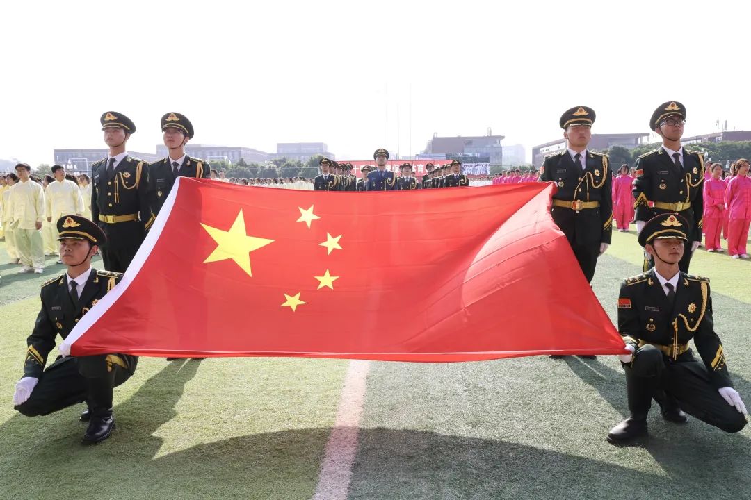 上午8点30分,伴随着《运动员进行曲》,国旗护卫队精神抖擞、步伐整齐地托举五星红旗通过主席台。随后,校旗队、会旗队依次入场,紧随其后的是喊着嘹亮口号、迈着有力步伐的师生代表队。入场完毕后,全体起立,升国旗,奏唱国歌。