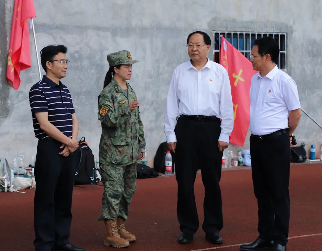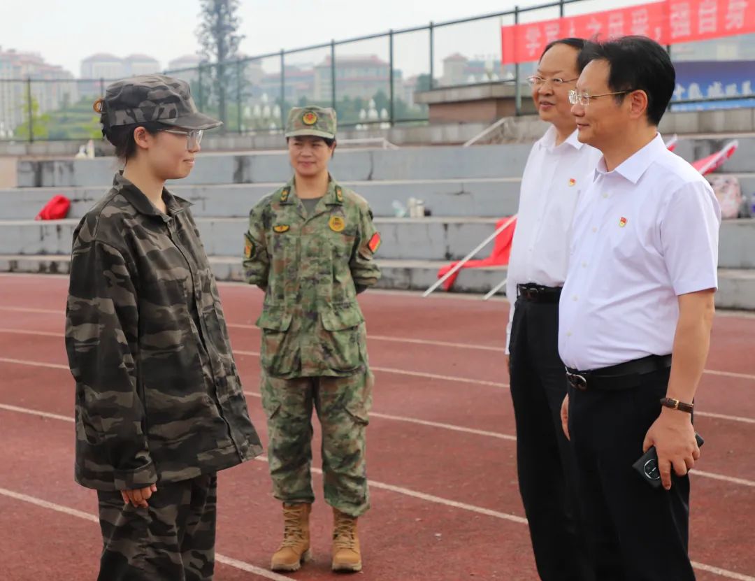 “同学,有没有困难?坚持就是胜利!”校领导与参训学生深入交流,详细询问学生们在军训期间的饮食起居、身体状态以及训练情况,对军训阶段性成绩给予肯定和鼓励。