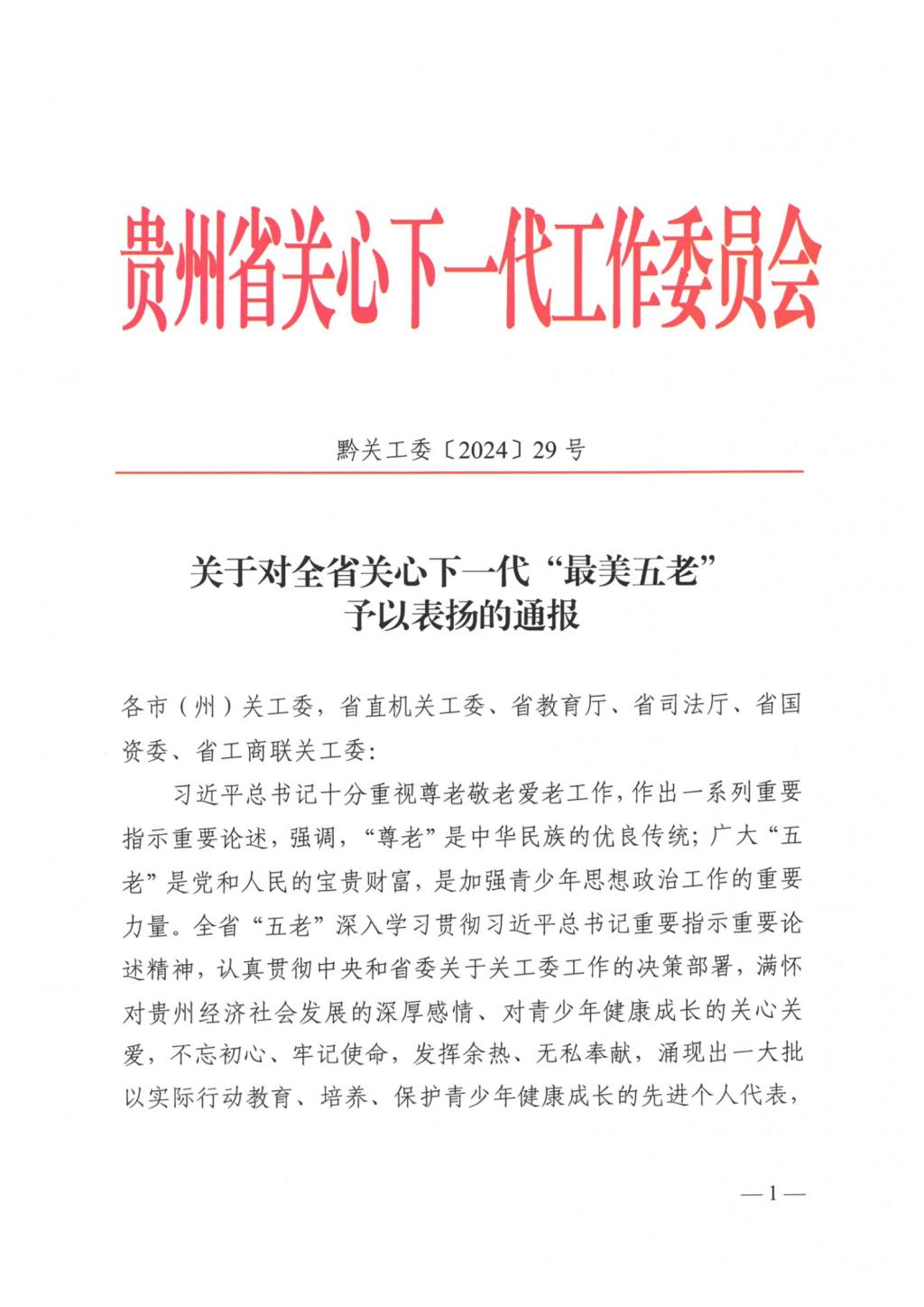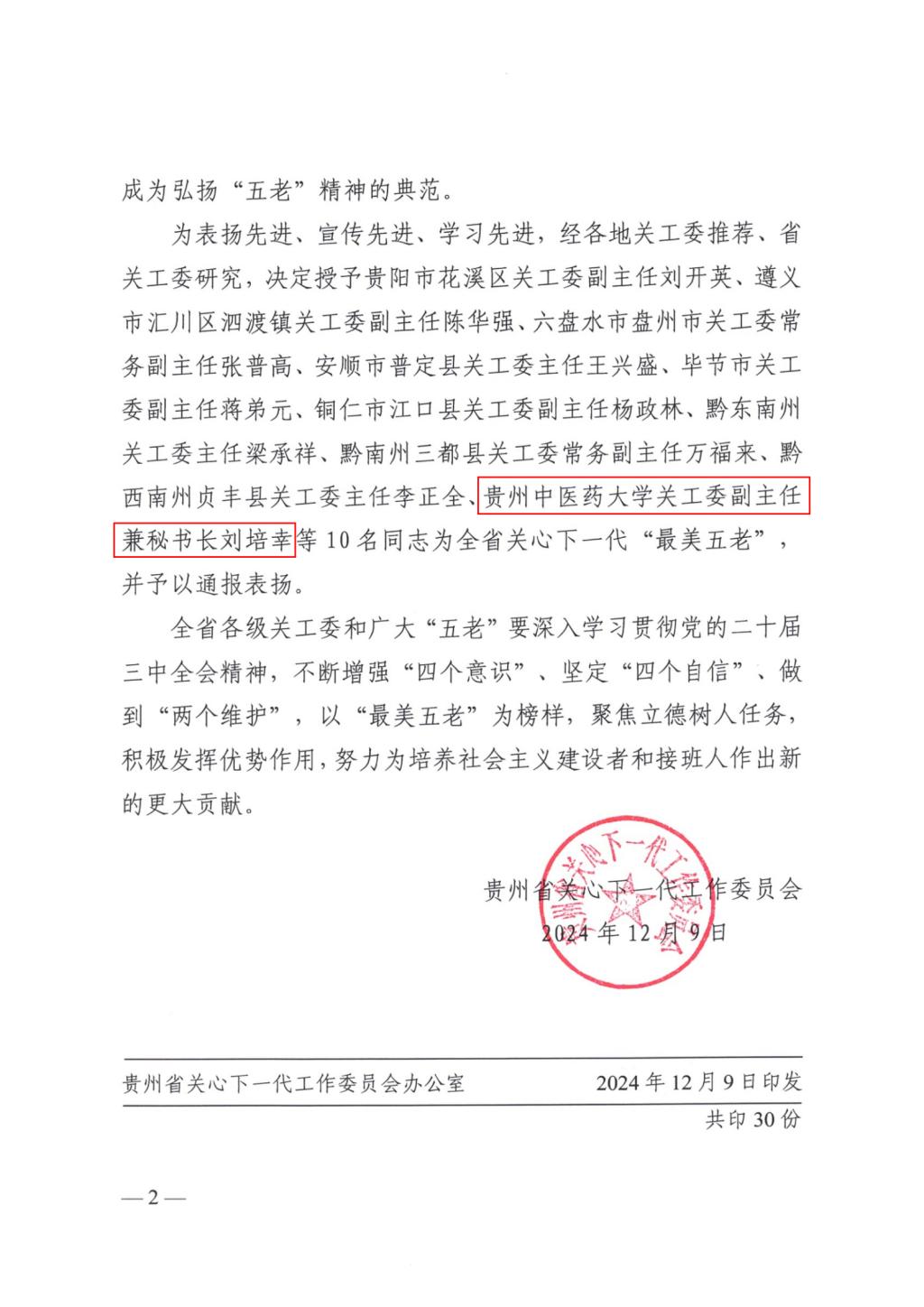 近日,经各地关工委推荐,贵州省关心下一代工作委员会研究决定,对10位全省关心下一代“最美五老”予以表扬。我校关工委副主任兼秘书长刘培幸榜上有名。