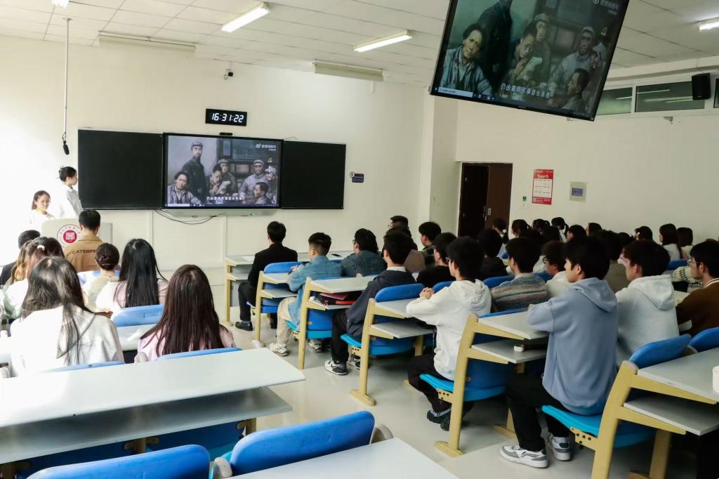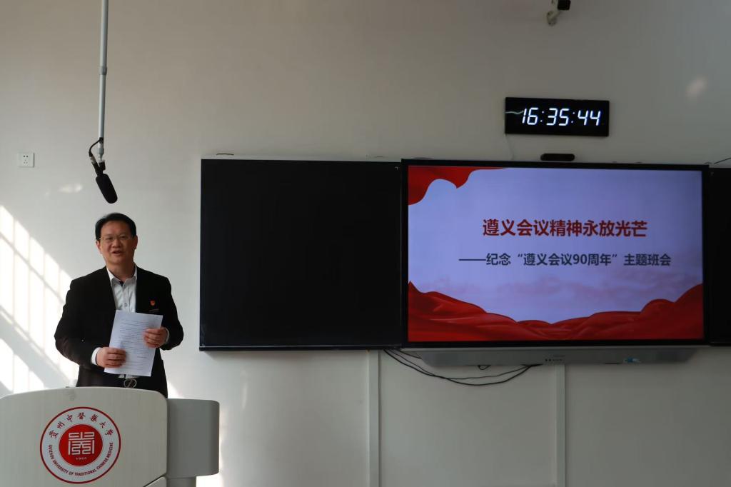 主题班会课上,形式多样,内容丰富。视频导入,营造了浓厚的历史氛围;配乐朗诵,激发了学子的情感共鸣。邬卫东以《传承遵义会议精神,勇担中医药振兴使命》为题,用丰富的历史知识和深刻的思考见解,全面、系统、生动地为同学们讲授了遵义会议的历史背景、过程、意义以及遵义会议精神的基本内涵。他指出,长征途中召开的遵义会议,在最危急关头挽救了党、挽救了红军、挽救了中国革命,成为党的历史上生死攸关的转折点。遵义会议蕴含着“坚定信念、坚持真理、独立自主、团结统一”的精神内核,至今熠熠生辉,对新时代中医学子有着重要的启迪。他强调,历史是最好的教科书,弘扬遵义会议精神,一是要铭记历史、牢记启迪,不断从遵义会议的历史昭示中汲取理论的力量、真理的力量、团结的力量;二是要从守正创新的科学态度、独立自主的文化自信、团结奋进的使命担当上着眼,深刻认识到遵义会议精神与中医药事业的深层共鸣,以实事求是的态度传承国粹,以独立自主的品格守正创新,以团结奋进的姿态振兴中医药;三是要以遵义会议精神照亮岐黄之路,努力做实事求是的践行者、文化自信的传承者、攻坚克难的开拓者,让红色基因融入医者仁心,走好新时代中医人的长征路。