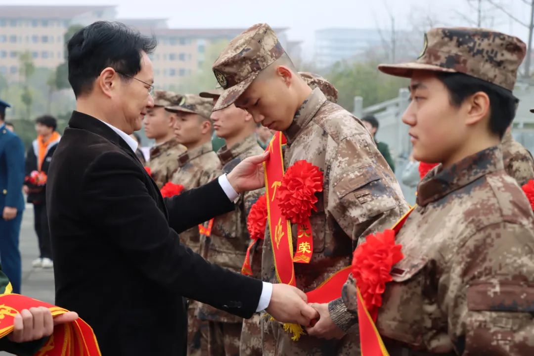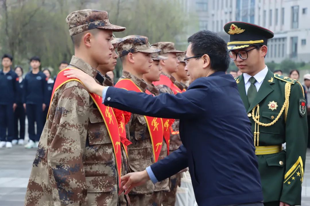 欢送会上,校领导为新兵一一佩戴绶带并赠送纪念品,表达对他们的美好祝福和期待。