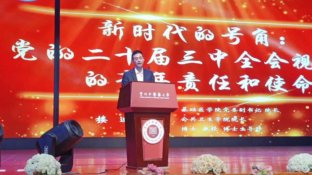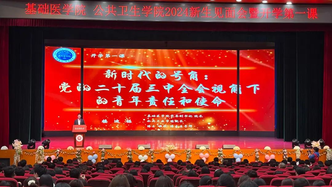 基础医学院党委副书记、院长,公共卫生学院院长楼迪栋代表学院全体教师对各位新生的到来表示欢迎,并以“新时代的号角——党的二十届三中全会视角下的青年责任和使命”为题为新生讲授“开学第一课”。他生动阐述党的二十届三中全会的历史地位和重要意义,探讨了青年如何以党的二十届三中全会精神为指引,在新时代主动担负责任和历史使命。希望各位同学从中汲取精神力量、明确奋斗目标,怀揣梦想,勇往直前,自觉投身中国式现代化建设的伟大实践。