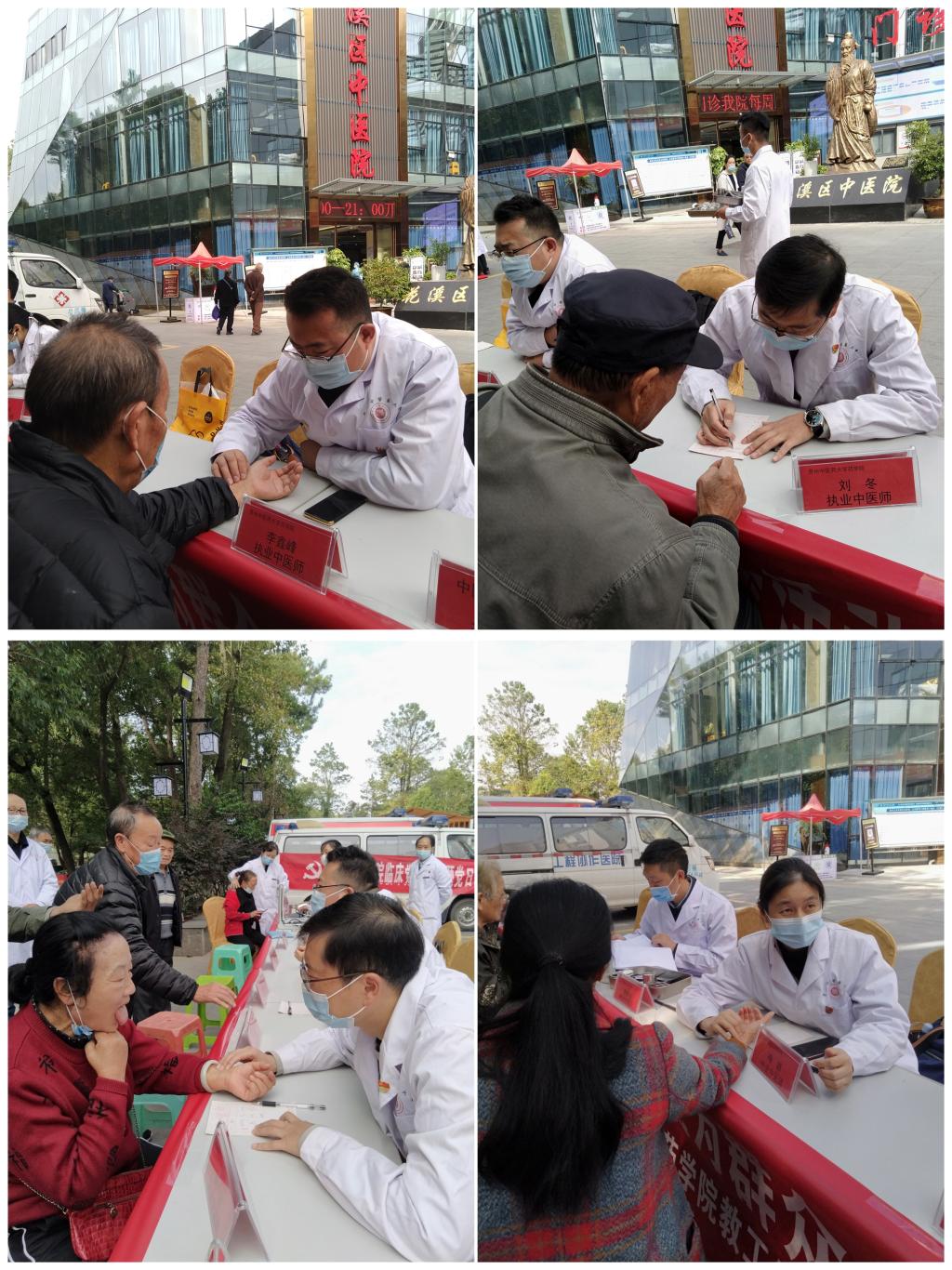 在花溪区中医院门诊综合楼前,药学院教工第四党支部李煦照、刘冬、梅颖等7名党员、入党积极分子及花溪区中医院医务工作者,热情接待着前来看病的每一位患者。通过中医传统的望闻问切,结合专业知识和临床经验,大家为患病群众提出合理的治疗建议;针对个体疾病的防治及用药知识进行宣教,并嘱咐病人日常饮食起居应注意的事项。