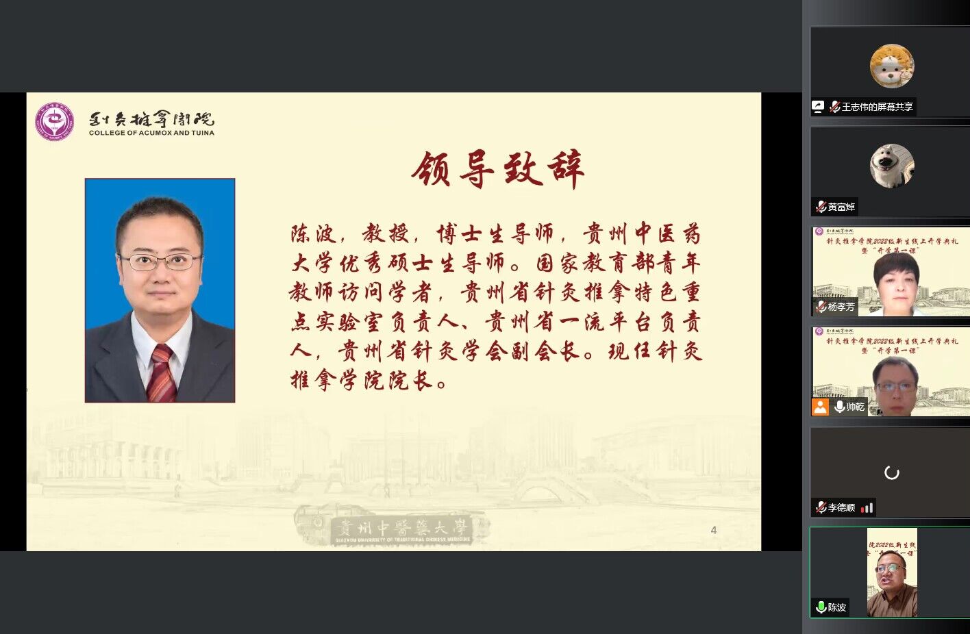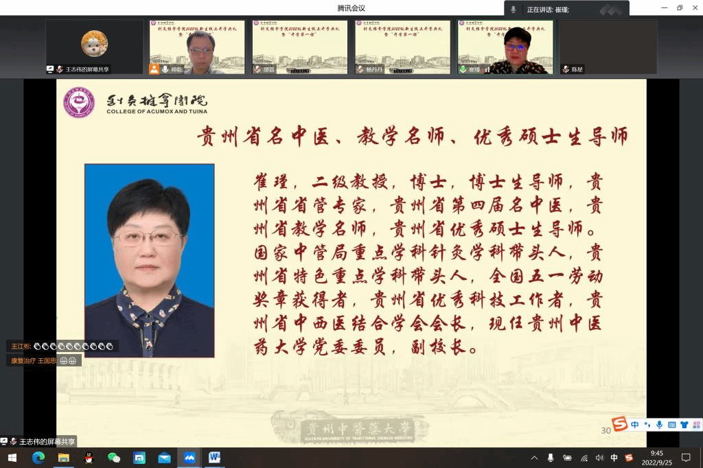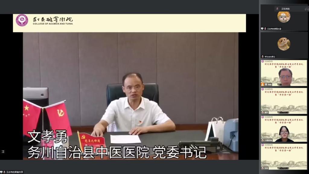 9月25日,为做好疫情防控状态下的2022级新生入学思想教育工作,针灸推拿学院举办了2022级新生线上开学典礼暨“开学第一课”。本次活动分为“开学典礼”“名医名师寄语与新生互动”及“新生开学第一课暨思想教育”三个部分。
