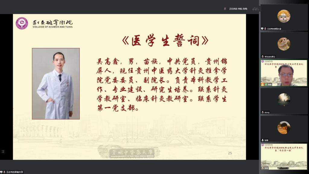随后优秀毕业生校友通过视频表示希望同学们在今后的求学问道之路上能潜心问道、精进医术、永攀高峰,成为岐黄之道的传承人。