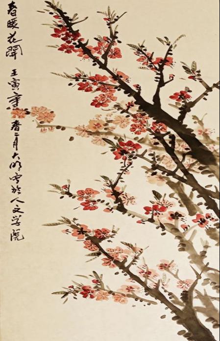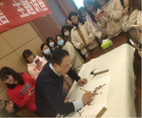 一番名画鉴赏后,吴老师来到同学中间现场作画,把现场活动的热烈气氛推入高潮。他边与同学互动边创作,短短30分钟,一幅《春暖花开》水墨画便呈现在大家眼前,深厚的笔墨功夫让在场的老师和同学们赞叹不已。大家无不感慨,仅用简单的几个颜色,便能画得如此精妙,中国的水墨画真是博大精深。活动结束后,同学们纷纷来到吴老师身边,和吴老师合影留念。