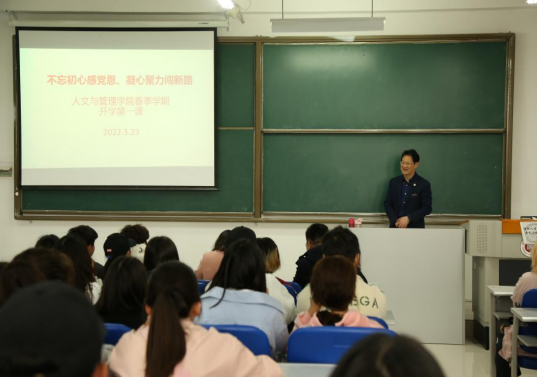 2022年3月23日中午,校党委副书记邬卫东以“不忘初心感党恩、凝心聚力闯新路”为主题,到人文与管理学院讲授“开学第一课”,人文与管理学院院长吴小勇、团委书记刘嘉洋及2021级学子们参加了学习讨论。邬卫东从新国发2号文件的时代背景、核心内容及该文件对贵州经济社会发展的重大意义三方面引领人文与管理学院师生对新国发2号文件进行了深入学习。