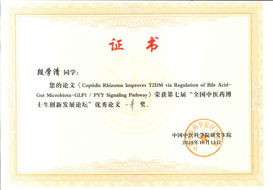 10月13日至14日,由中国中医科学院主办的第七届“全国中医药博士生创新发展论坛”在江苏苏州举行,同期举行了第五届全国中医药优秀博士学位论文颁奖仪式。我校遴选报送的两篇博士研究生论文从众多参赛者中脱颖而出,双双获得“优秀论文一等奖”,体现了学校在中医药拔尖创新人才培养方面的扎实功底与领先水平,为推动中医药传承创新与发展贡献更多“贵中医”智慧和力量。
