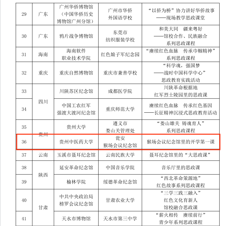 近日,国家文物局办公室、教育部办公厅公布2024年度以革命文物为主题的“大思政课”优质资源建设推介项目名单,其中示范项目10个、精品项目100个。我校申报的《猴场会议纪念馆里的开学第一课》入选精品项目名单。贵州省仅2个项目入选。