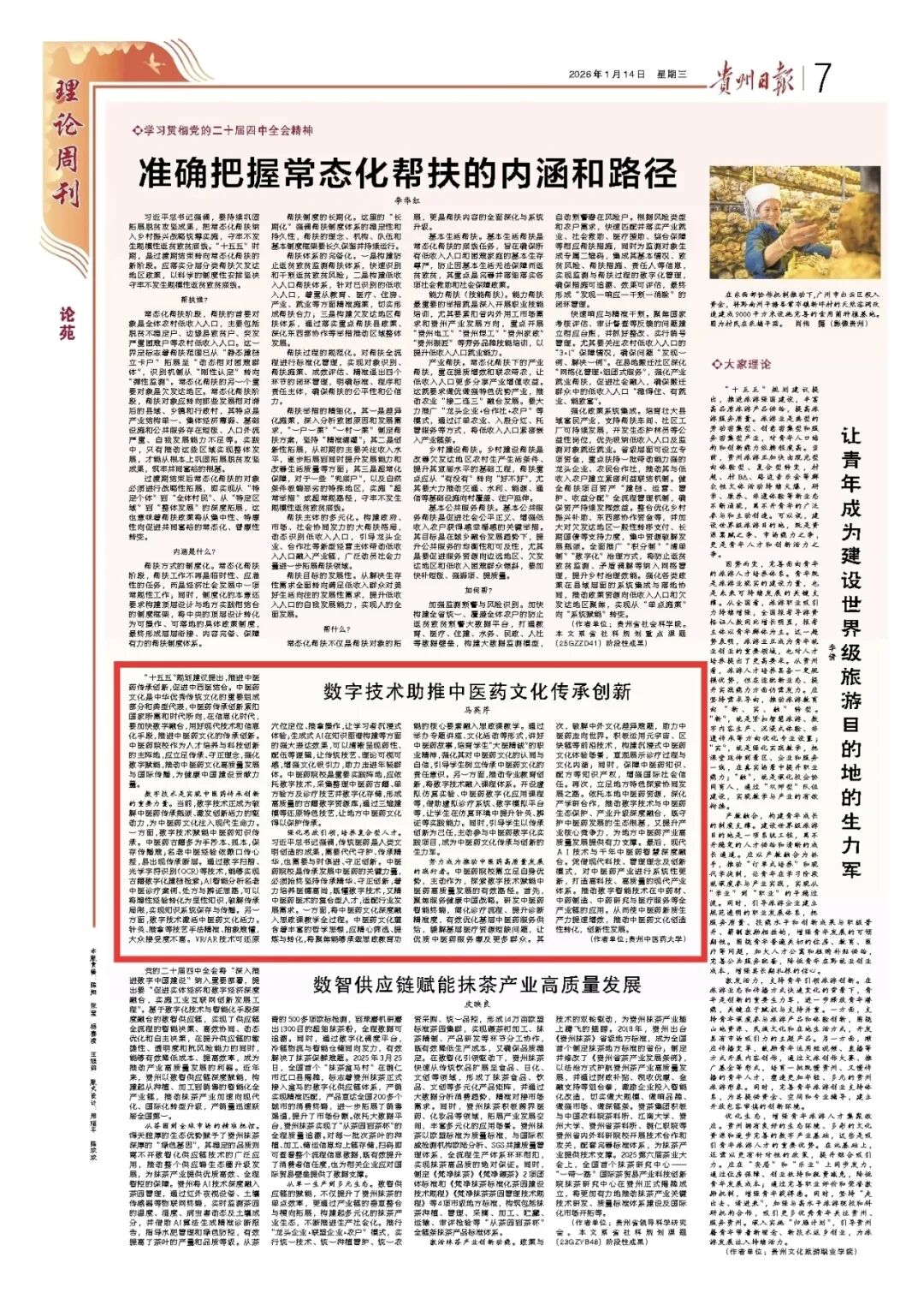 1月14日,《贵州日报》在“理论周刊”刊发我校马克思主义学院教授马英芹署名文章《数字技术助推中医药文化传承创新》。