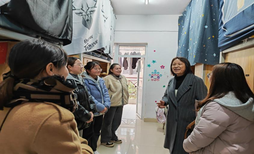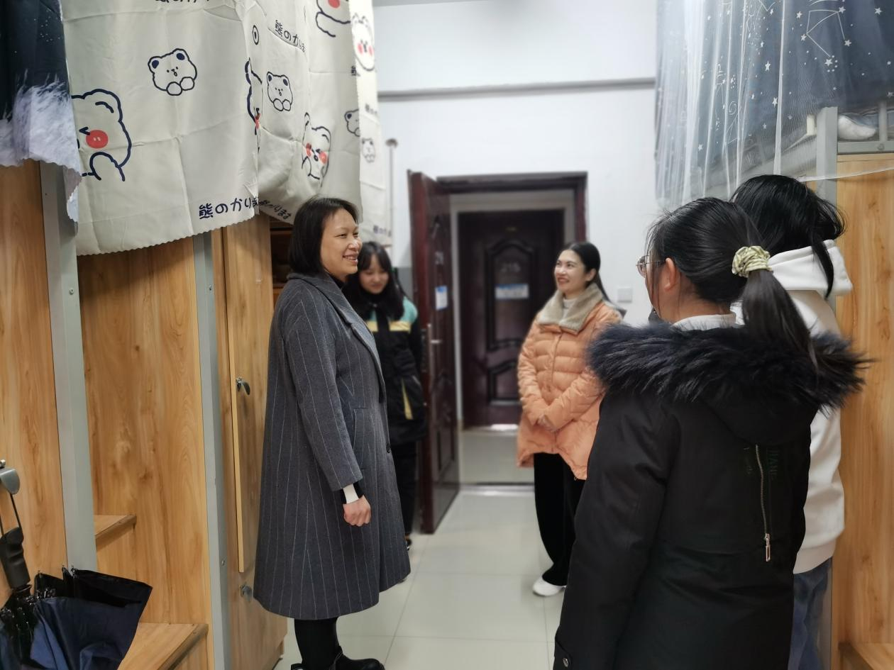 每到一间寝室,滕红都仔细询问同学们近期的学习、生活情况,临近期末考试有没有学习压力?食堂的饭菜怎么样?生活中有没有困难?从晚自习的学习习惯,到未来的学业发展,她都耐心听取同学们的回答。