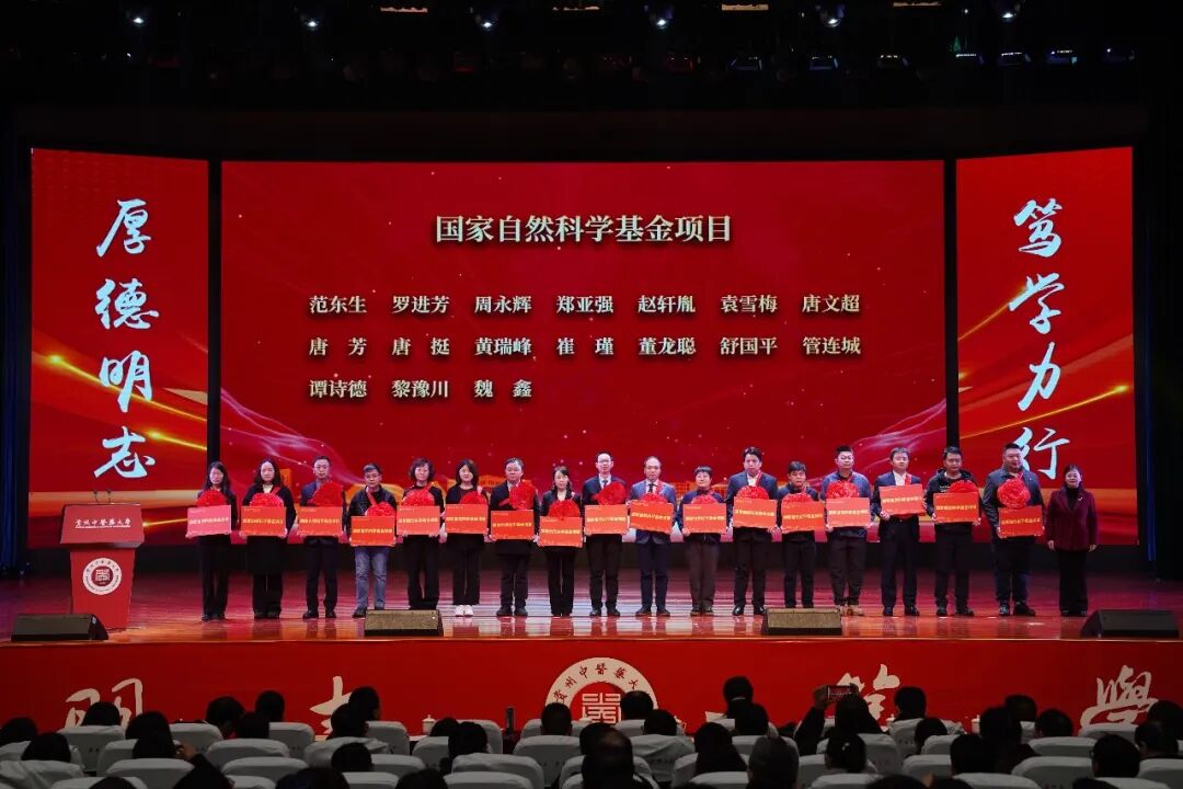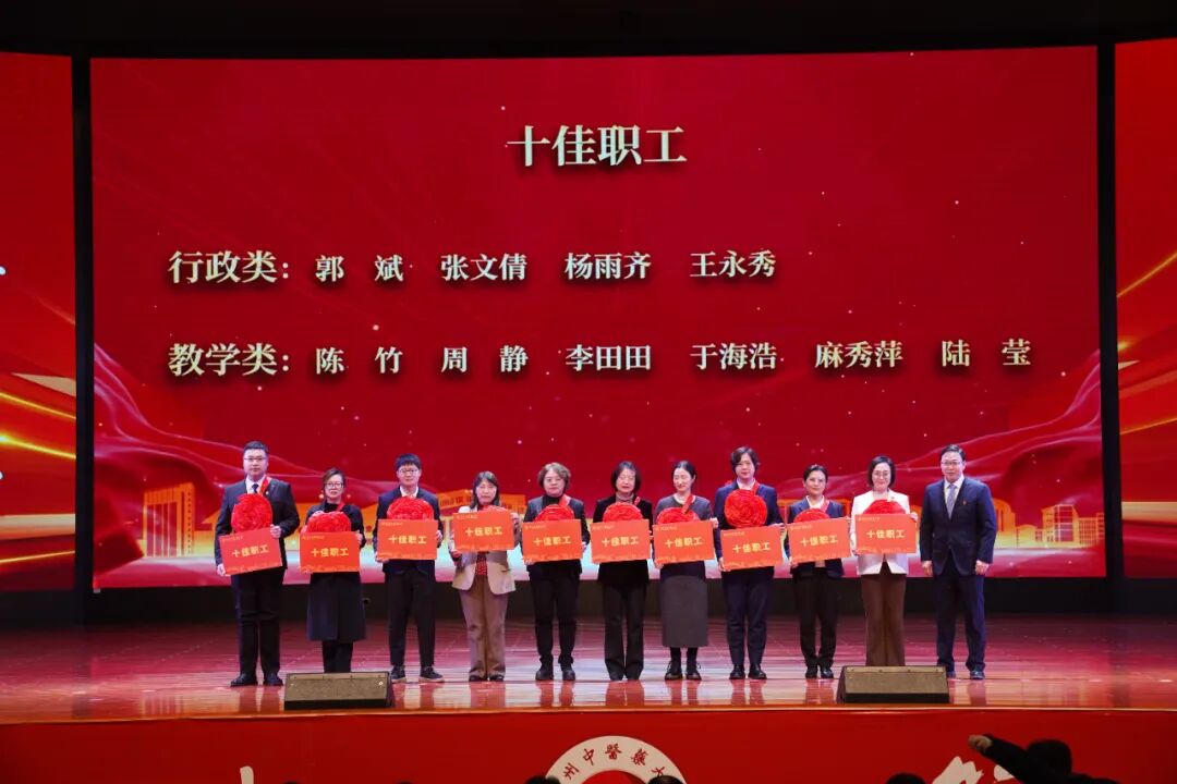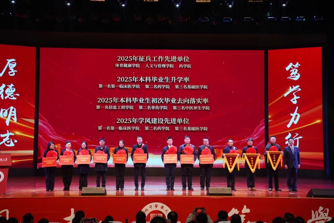 会上,2025年在教学、科研、学生管理等领域作出突出贡献及获得省级以上荣誉的团队和个人,就业、升学业绩奖获奖学院,第二届“十佳员工”获得者,第二批“青年英才”获聘者等受到表彰。校领导为获奖者颁奖。